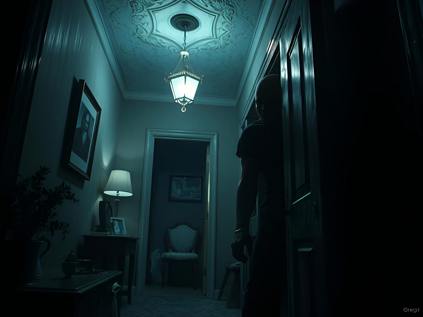 He paused at the entrance to the hallway and peered from the dining room into the living room. The streetlight outside poured light through the living room window and backlit the partially drawn sheer curtains his mom had hung years before. His heart quickened at the sight of a human shape, but relented just as quickly when he realized it was the coat rack next to the front door, draped in a hooded sweatshirt.
